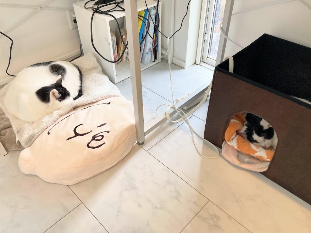 昨年から愛用している暖房器具「暖話室」ですが、先日のもなかの体調不良をきっかけに、今年はリビングではなく猫部屋を中心に配置しています。