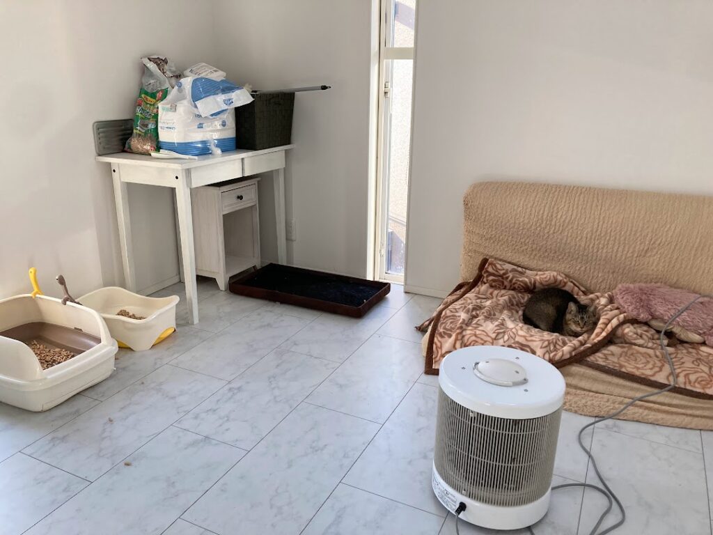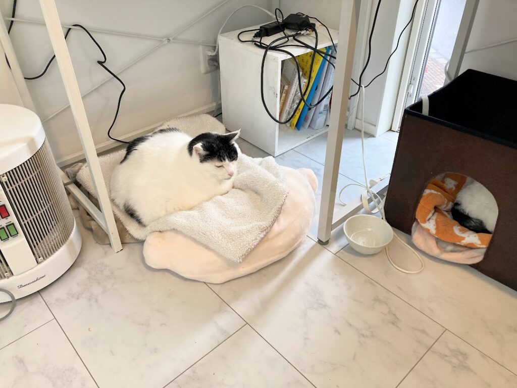 猫らの体調・快適さを考えて暖話室をどこに置いたのか、実際の様子とあわせてご紹介します。