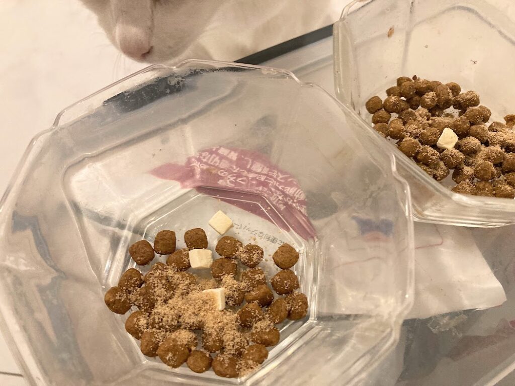パウダーをかけたカリカリは残しがちなのですが、パウチにかければ完食してくれるのでヨシ!!