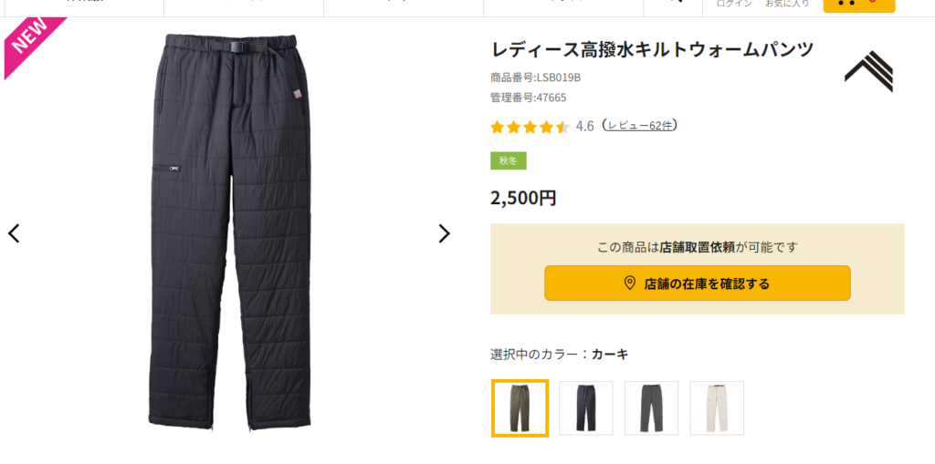 そんなときに近所のワークマンで購入したキルトウォームパンツ。